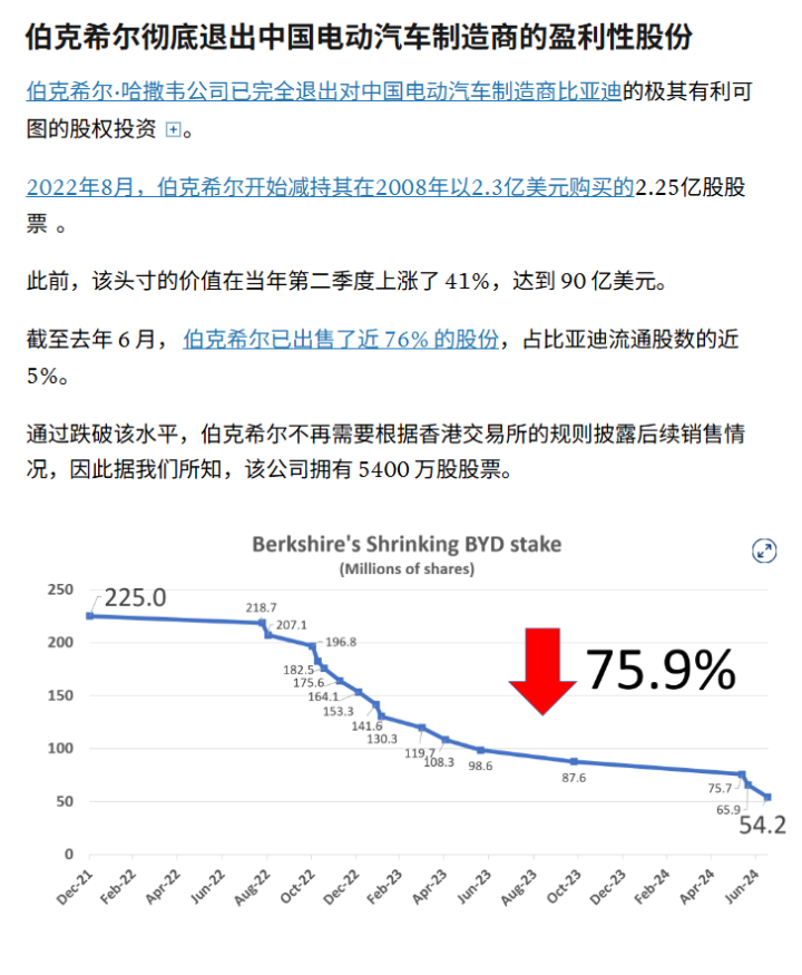 9月21日,据CNBC报道,巴菲特旗下的伯克希尔已完全退出其在中国电动汽车制造商比亚迪的股权投资。
